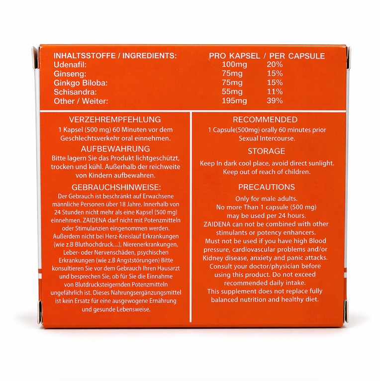 ZAIDENA ist eine speziell für erwachsene Männer entwickelte Nahrungsergänzung. Udenafil wird in dieser Rezeptur mit einer Auswahl an pflanzlichen Inhaltsstoffen wie Ginseng, Ginkgo Biloba und Schisandra kombiniert, die traditionell zur Steigerung der Vitalität, der Durchblutung und der körperlichen Leistungsfähigkeit eingesetzt werden.